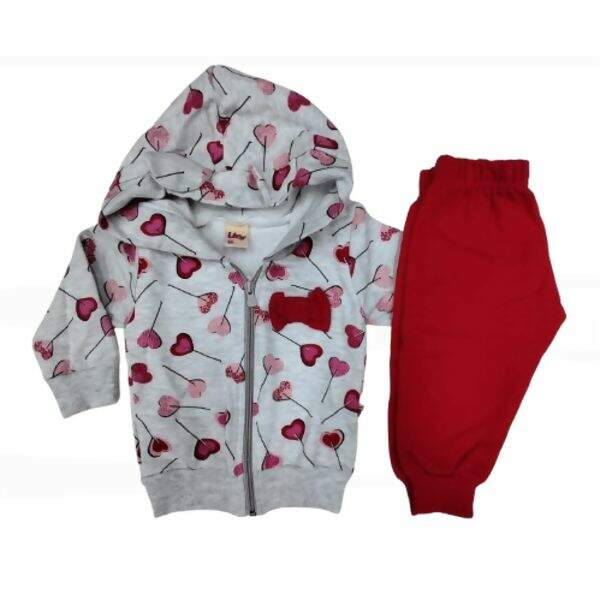 Conjunto de blusão e calça confeccionados em moletom flanelado. O blusão possui capuz ,